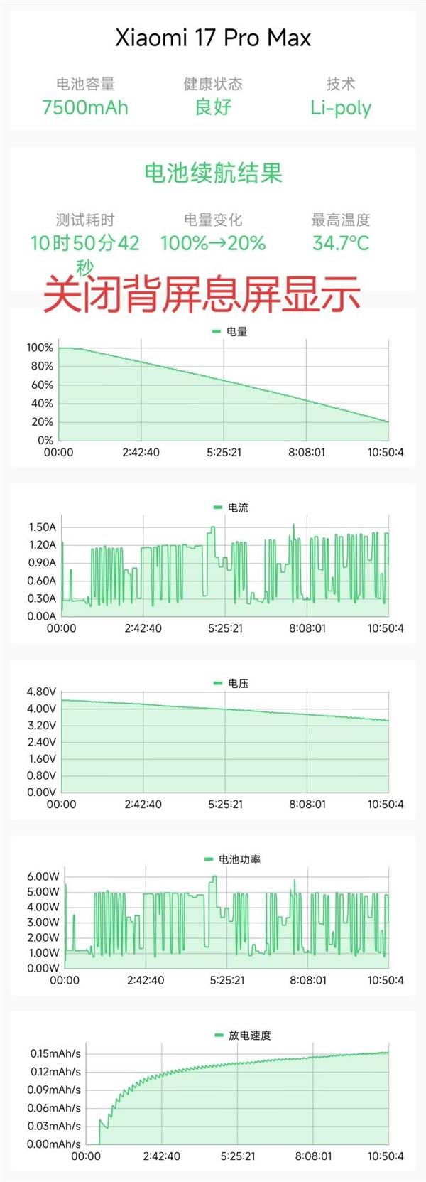 我们在电量剩余1%,开启急速充电模式进行息屏实测,每五分钟采集一次数据。