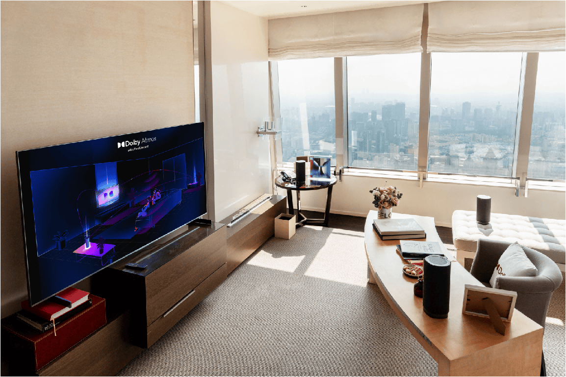 无论何种组合,杜比全景声 FlexConnect 都可以让声音智能地从电视的扬声器散布到每个无线扬声器上,并根据所有可用扬声器的能力和位置,动态优化声音信号,确保用户始终获得一流的声音体验。