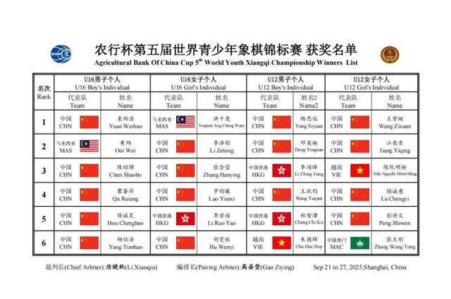 世青赛中,中国小将们发挥出色。中国棋手袁玮浩获得U16男子冠军。马来西亚洪千惠摘得U16女子冠军。中国棋手杨思远以8胜1和的不败战绩一举夺得U12男子冠军。中国棋手王紫璇获得U12女子冠军。