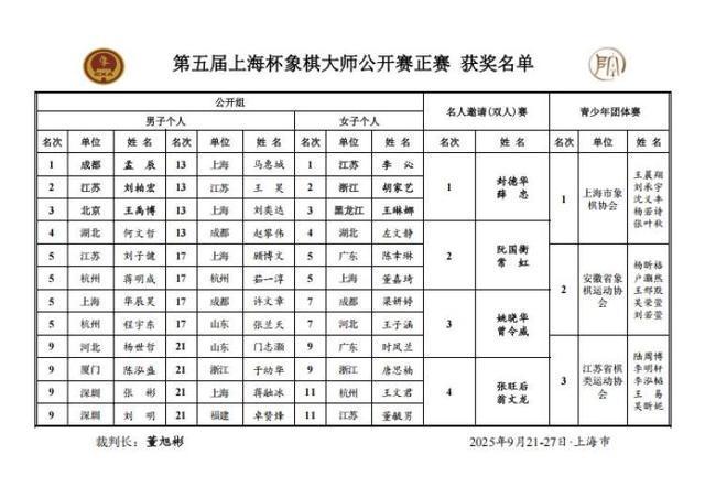 同一赛场,第五届上海杯象棋大师公开赛的公开男女组决赛也分出了胜负。孟辰战胜刘柏宏夺得男子组冠军,王禹博获得季军。女子组中,李沁、胡家艺、王琳娜分获前三名。